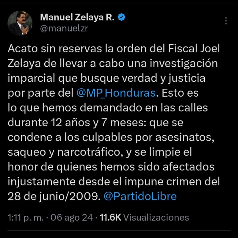 Acato sin reservas la orden del fiscal general de llevar a cabo una investigación transparente y justa”, afirmó Zelaya en su mensaje. Su respaldo a la decisión del Ministerio Público no solo refleja su compromiso con el proceso judicial, sino también con las demandas históricas de la población.