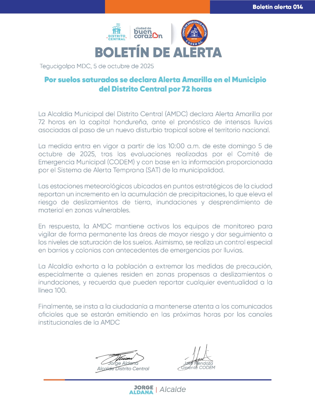 Tegucigalpa, Honduras.- La Comisión Permanente de Contingencias (Copeco) decretó Alerta Amarilla por 72 horas en el Distrito Central, debido a las condiciones climáticas adversas que podrían generar inundaciones, deslizamientos y daños en infraestructuras vulnerables.