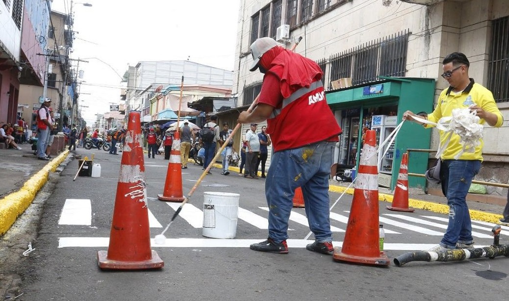 Tegucigalpa, Honduras.- Equipos de la Alcaldía Municipal del Distrito Central (AMDC), realizaron trabajos de intervención en la cuarta avenida de Comayagüela, con labores de señalización vial y pintado de bordillos y pasos de cebra.