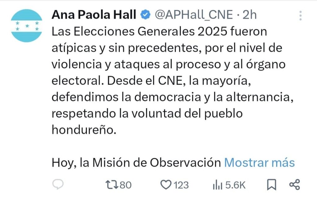 El pronunciamiento no solo marca posición institucional, también abre un nuevo capítulo en el debate público. Hall subrayó que el proceso electoral fue atípico, sin precedentes, marcado por violencia, ataques sistemáticos al órgano electoral e intentos de deslegitimación. Sin embargo, defendió que desde la mayoría del CNE se actuó con firmeza para proteger la alternancia democrática además de respetar la voluntad soberana del pueblo hondureño.