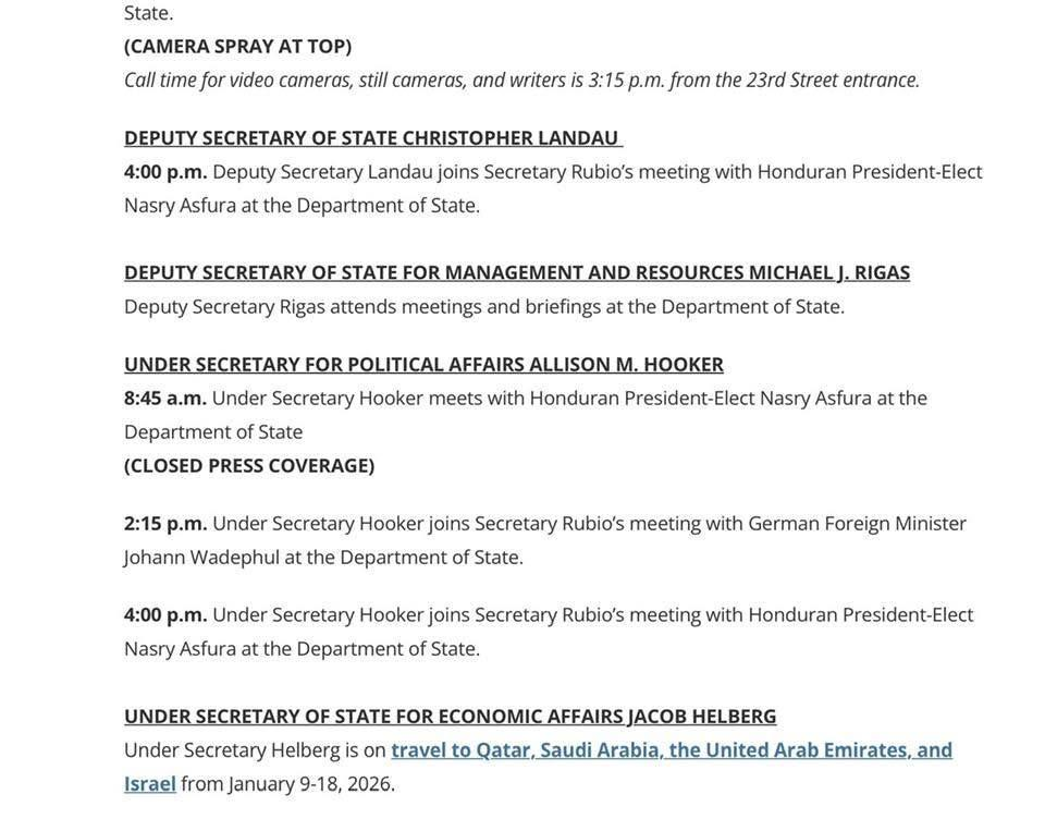 Según el cronograma público, Asfura sostuvo una reunión central con el secretario de Estado, Marco Rubio, acompañado por el subsecretario Christopher Landau, en la sede del Departamento de Estado, donde se discutieron prioridades bilaterales y escenarios regionales de interés común.