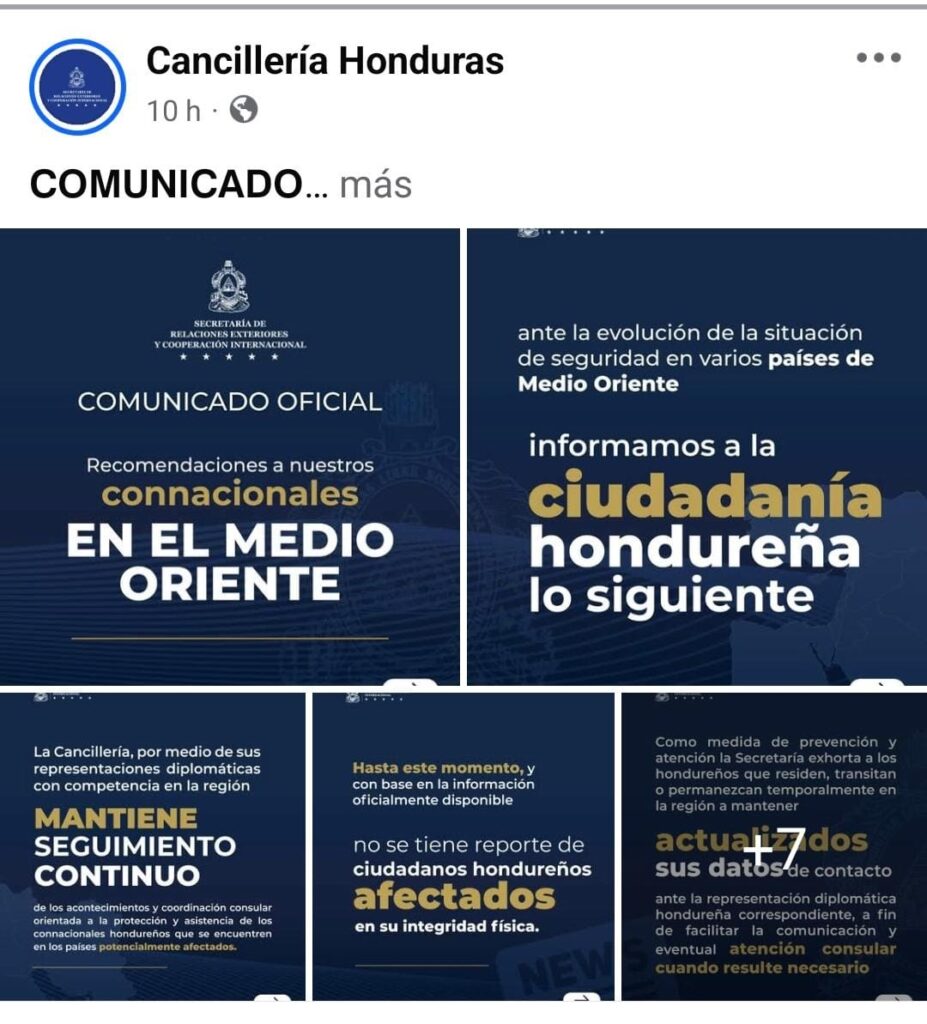 La Cancillería hondureña informó la noche del viernes que mantiene monitoreo permanente de la situación de seguridad en Oriente Medio, en estrecha coordinación con embajadas, consulados, redes diplomáticas en la región. El objetivo central consiste en garantizar protección, asistencia consular inmediata para ciudadanos hondureños que residen, laboran o realizan actividades académicas en esa zona estratégica del planeta.