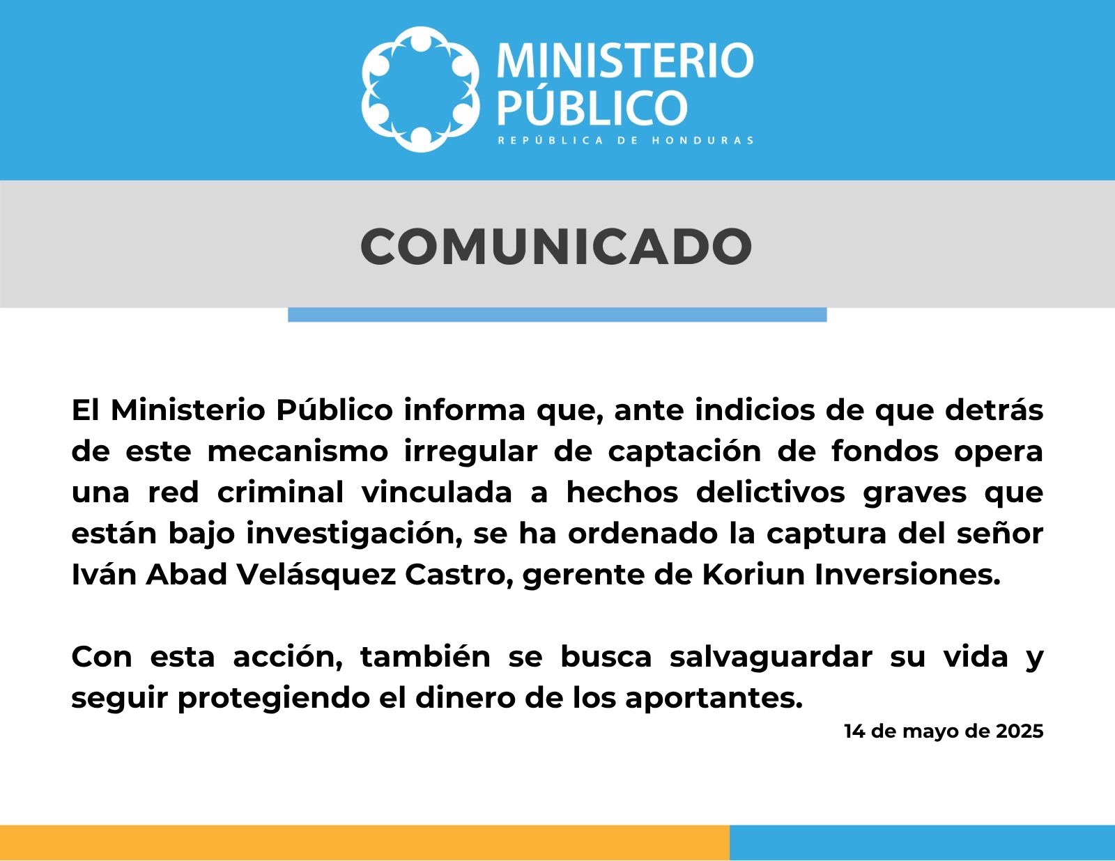 Tegucigalpa, Honduras.- El Ministerio Público ha ejecutado este martes una orden de captura contra Iván Abad Velásquez Castro, gerente general de Koriun Inversiones, señalado como parte de una presunta estructura criminal dedicada a captar fondos de forma fraudulenta en Honduras.