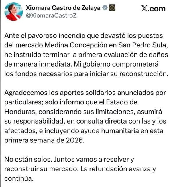 A través de su cuenta oficial en X, la mandataria informó que ha instruido acelerar la evaluación de daños, con el objetivo de iniciar de forma inmediata el proceso de recuperación. “Mi gobierno comprometerá los fondos necesarios para iniciar la reconstrucción del mercado”, expresó Castro, subrayando que la respuesta estatal será directa, responsable y coordinada con los afectados.