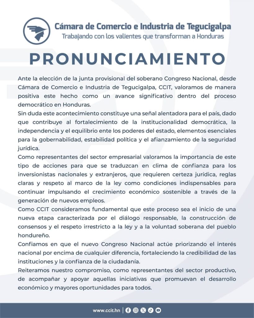 Tegucigalpa, Honduras.- En un contexto marcado por la expectativa ciudadana y la observación internacional, la Cámara de Comercio e Industria de Tegucigalpa (CCIT) calificó como una señal alentadora la reciente elección de la junta provisional del Congreso Nacional, destacando su impacto directo en la estabilidad política y la gobernabilidad democrática del país.