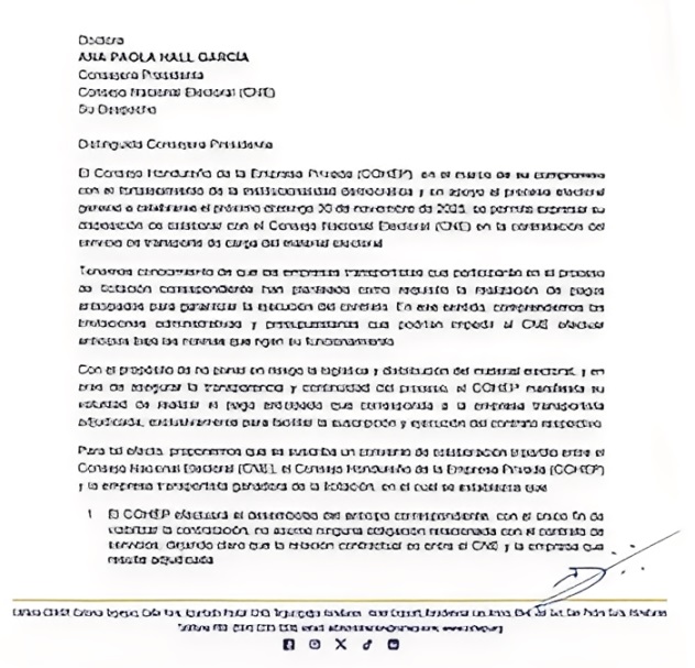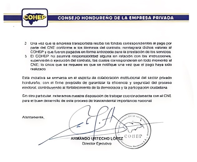 El COHEP ha propuesto la firma de un convenio tripartito entre el CNE, la empresa transportista seleccionada y el propio Consejo. Bajo esta estructura, el COHEP facilitaría el pago anticipado requerido para el servicio de transporte sin asumir responsabilidad sobre la ejecución del contrato, la cual quedaría a cargo exclusivo del CNE.