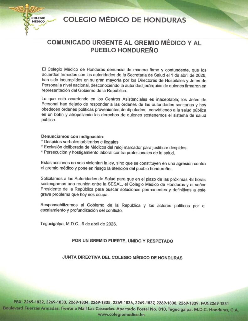 Tegucigalpa, Honduras | HonduPrensa.Com — El Colegio Médico de Honduras (CMH), liderado por Samuel Santos, elevó el tono este lunes al emplazar al gobierno con un plazo de 48 horas para sostener una reunión urgente con autoridades de la Secretaría de Salud junto al presidente Nasry Asfura, en medio de una creciente ola de denuncias por falta de pagos a miles de galenos.