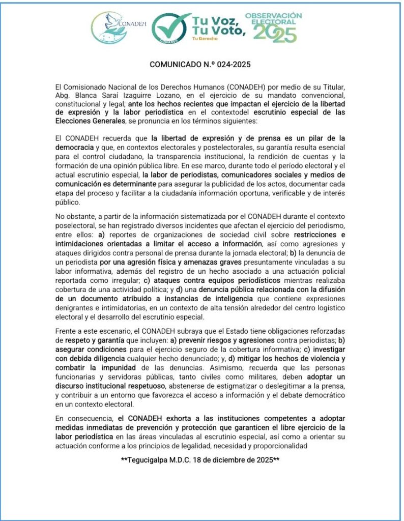 El Conadeh enfatizó que las personas funcionarias y servidoras públicas, tanto civiles como militares, deben adoptar un discurso institucional respetuoso hacia la prensa, abstenerse de estigmatizar o deslegitimar a los periodistas, y promover un clima de respeto que favorezca el acceso a la información y el debate democrático, especialmente en el marco de las elecciones nacionales.