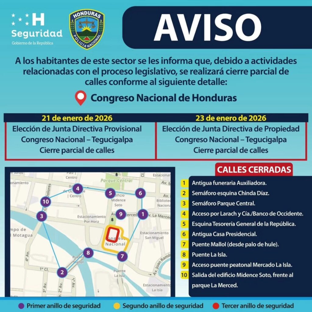 La Secretaría de Seguridad junto a la Policía Nacional confirmó el cierre parcial de calles en los alrededores del Congreso Nacional, como parte de un operativo especial con tres anillos de protección, diseñado para garantizar el orden durante la elección de la junta directiva provisional y la posterior directiva en propiedad.