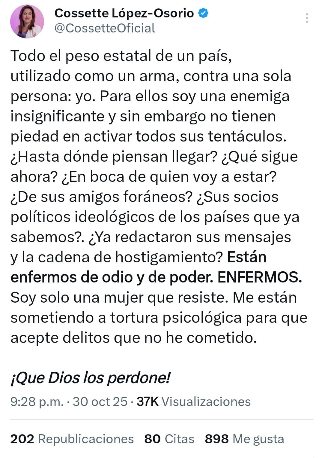 En su testimonio, López-Osorio calificó los métodos empleados en su contra como tortura psicológica, afirmando que busca resistir un intento sistemático por doblegar su voluntad y forzarla a aceptar delitos que asegura no haber cometido. “Están enfermos de odio y de poder. ENFERMOS. Soy solo una mujer que resiste. Me están sometiendo a tortura psicológica para que acepte delitos que no he cometido. ¡Que Dios los perdone!”, enfatizó.