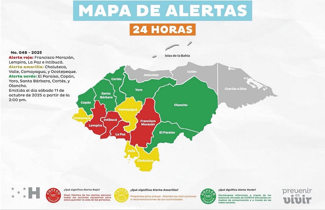 Además de la alerta roja, COPECO ha mantenido en alerta amarilla los departamentos de Choluteca, Valle, Comayagua y Ocotepeque, y en alerta verde a El Paraíso, Copán, Yoro, Santa Bárbara, Cortés y Olancho. Esto indica que, aunque el riesgo en estas zonas es menor, se deben tomar precauciones ante posibles lluvias moderadas.