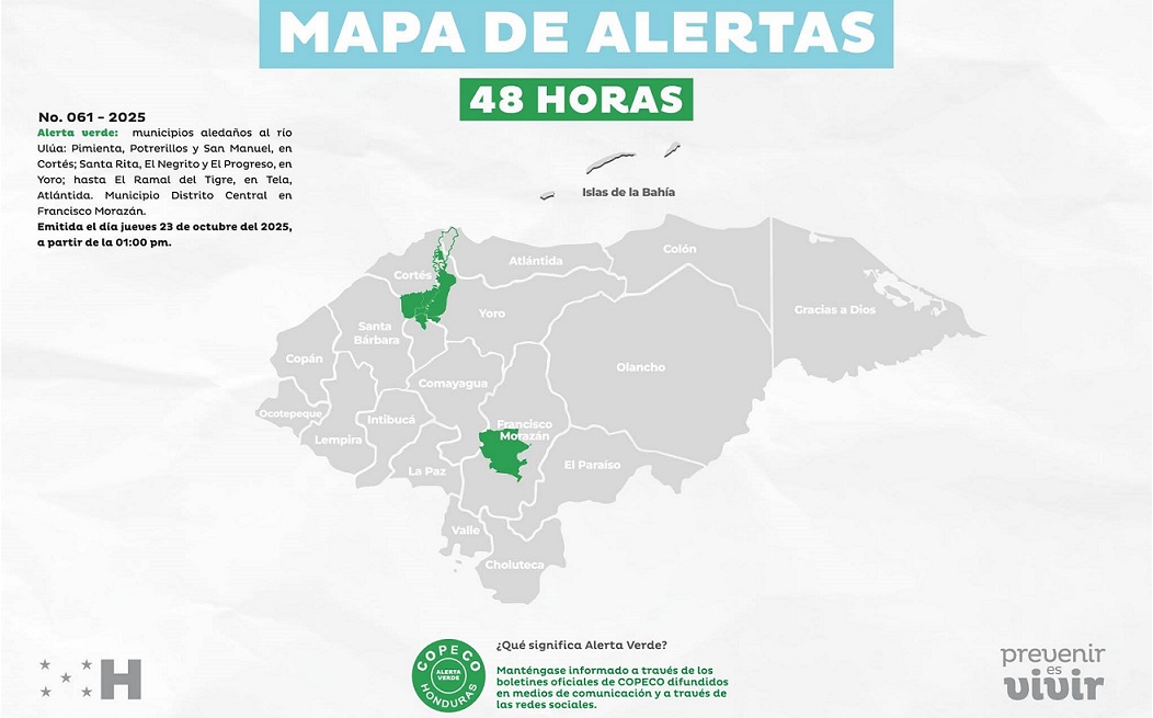 La medida también abarca a los municipios ubicados en la zona del río Ulúa, entre ellos: Pimienta, Potrerillos y San Manuel (Cortés); Santa Rita, El Negrito y El Progreso (Yoro); y El Ramal del Tigre en Tela (Atlántida), debido a las descargas controladas provenientes de la represa hidroeléctrica El Cajón.