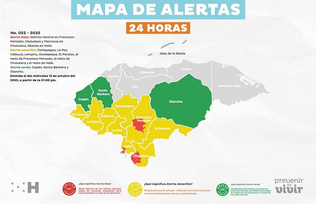 Según Copeco, los caudales de los ríos Choluteca y Goascorán siguen subiendo, lo que eleva el peligro para las zonas cercanas a estos cuerpos de agua. La alerta roja también abarca a los municipios de Choluteca, Marcovia, y Alianza en los departamentos de Choluteca y Valle, respectivamente. Además, la institución ha ampliado la alerta amarilla a varios departamentos, incluidos Comayagua, La Paz, Intibucá, Lempira, Ocotepeque, El Paraíso y otros sectores cercanos.