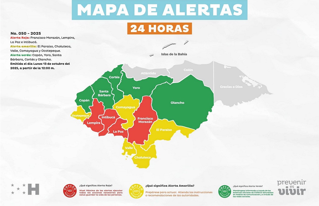 Tegucigalpa, Honduras.- La Secretaría de Gestión de Riesgos y Contingencias Nacionales (Copeco) ha decidido extender por 24 horas más la Alerta Roja en cuatro departamentos de Honduras debido a la persistente lluvia provocada por el desplazamiento de una vaguada que afecta a varias regiones del país. Además, se mantiene la Alerta Amarilla en cinco departamentos y la Alerta Verde en otros cinco, como medida preventiva ante las condiciones climáticas adversas.