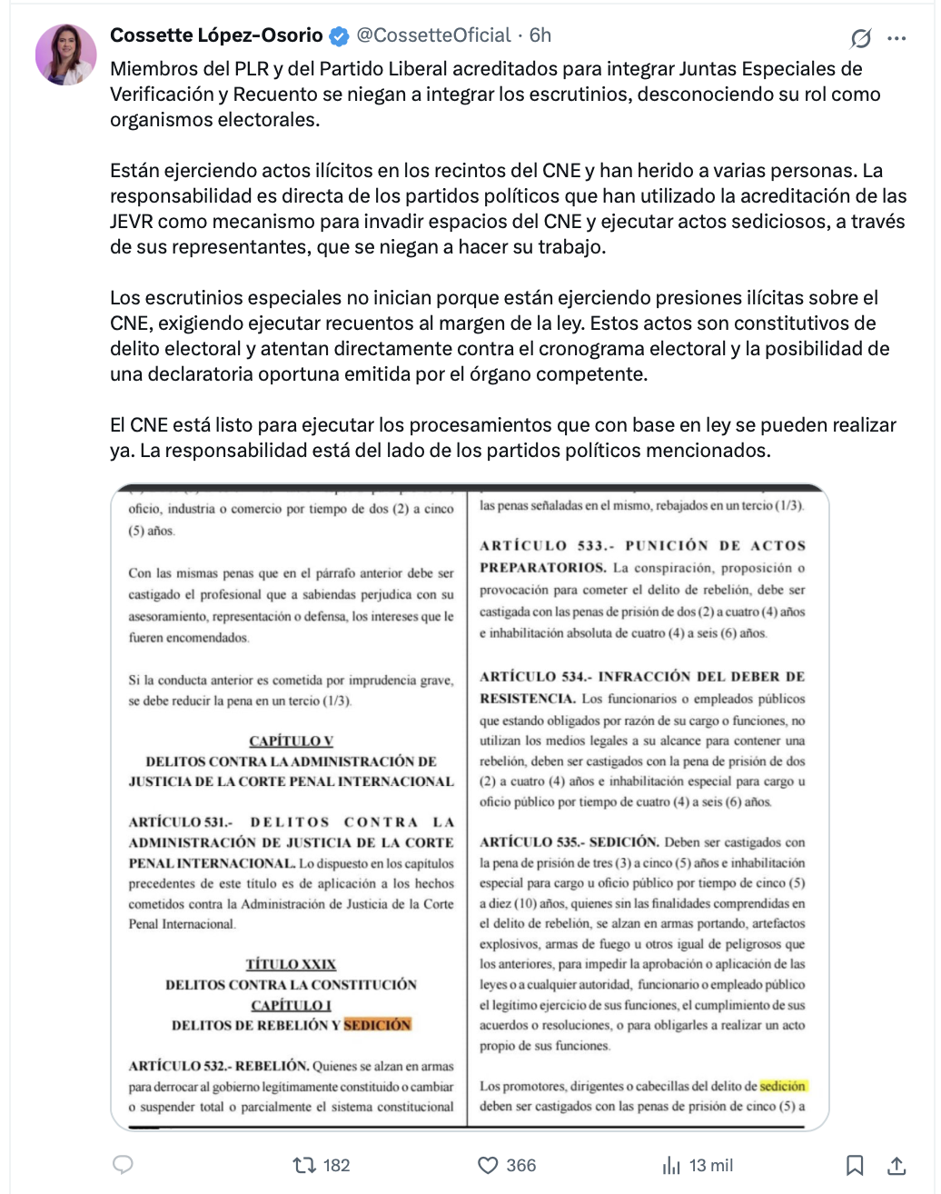 Tegucigalpa, Honduras | HonduPrensa.Com – El Consejo Nacional Electoral atraviesa uno de los momentos más tensos del proceso, luego que la consejera Cossette López-Osorio denunciara una ofensiva política ilegal, impulsada por representantes de Libre más Partido Liberal, destinada a sabotear los escrutinios especiales previstos por la normativa electoral.