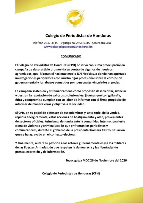 Tegucigalpa, Honduras.- El Colegio de Periodistas de Honduras (CPH) lanzó un firme pronunciamiento ante la campaña de desprestigio dirigida a periodistas de un reconocido medio de comunicación, quienes se han destacado por sus investigaciones sobre corrupción y abusos de poder en el país.