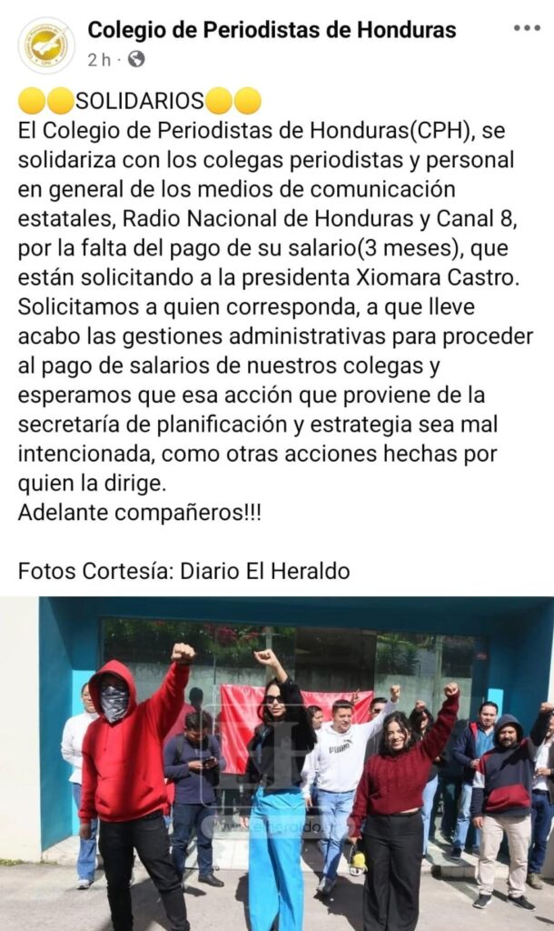 Tegucigalpa, Honduras | QuienOpina.Com.- En una muestra de solidaridad con los colegas de medios estatales, el Colegio de Periodistas de Honduras (CPH) se pronunció ante la protesta encabezada por los periodistas y empleados de Radio Nacional de Honduras y Canal 8, quienes exigen el pago de tres meses de salario, el respeto a su antigüedad y la asignación de plazas laborales. La falta de respuesta ha generado un clima de tensión, ante la necesidad urgente de que el gobierno tome cartas en el asunto.