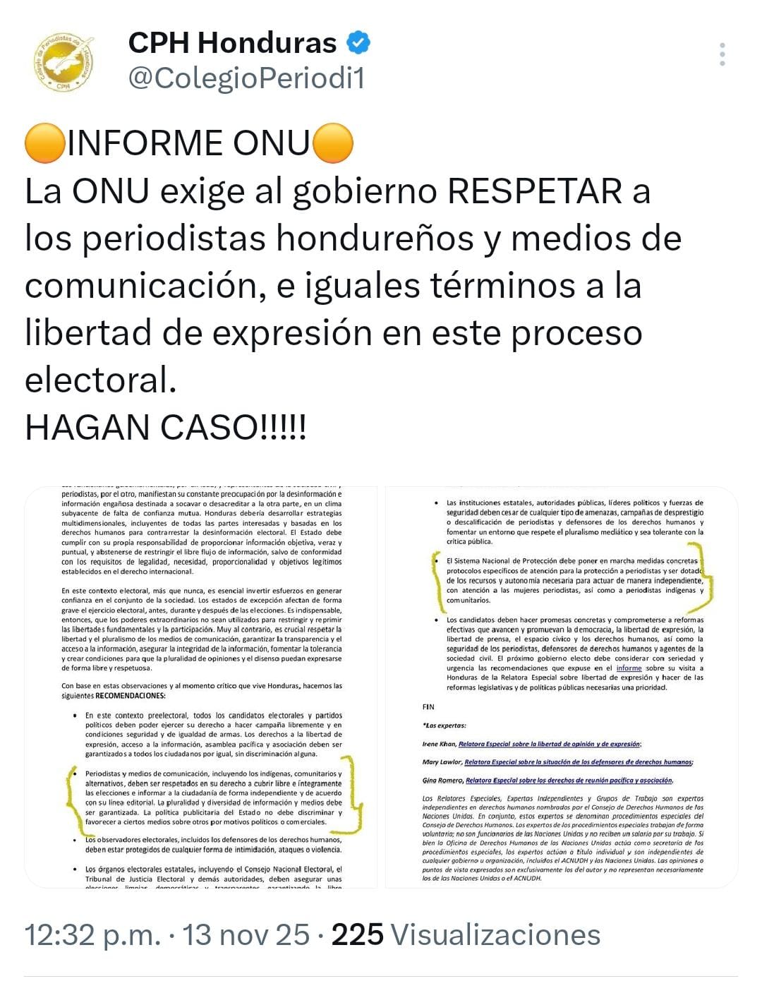 Tegucigalpa, Honduras.- El Colegio de Periodistas de Honduras (CPH) destacó este jueves el llamado de la Organización de las Naciones Unidas (ONU) al Gobierno hondureño para garantizar el respeto a los periodistas, medios de comunicación y la libertad de expresión, especialmente en el marco del actual proceso electoral.