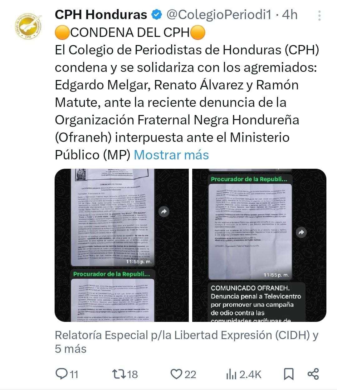 Tegucigalpa, Honduras.- El Colegio de Periodistas de Honduras (CPH) expresó su firme condena y solidaridad con los periodistas Edgardo Melgar, Renato Álvarez y Ramón Matute, tras la reciente denuncia presentada por la Organización Fraternal Negra Hondureña (Ofraneh) ante el Ministerio Público (MP). La denuncia acusa a varias personas, entre ellas a los mencionados periodistas, de promover discursos de odio contra las comunidades garífunas a través de los medios asociados a Televicentro.