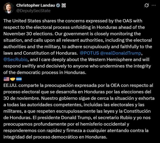 El diplomático agregó además que el presidente Donald Trump, el secretario Rubio y él mismo están “profundamente comprometidos con la estabilidad democrática del hemisferio occidental”, advirtiendo que Estados Unidos responderá con rapidez y firmeza ante cualquier intento de vulnerar la integridad del proceso democrático en Honduras.