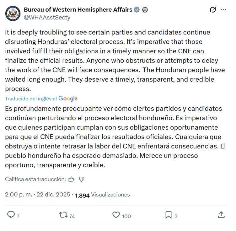 Tegucigalpa, Honduras.- La Oficina de Asuntos del Hemisferio Occidental de Estados Unidos se pronunció este lunes sobre el escrutinio especial que se desarrolla en Honduras para concluir los resultados oficiales del proceso electoral, manifestando su profunda preocupación por acciones que, según señaló, continúan afectando el normal desarrollo del proceso democrático.