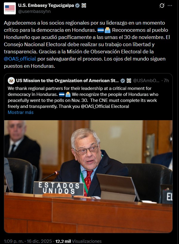 Tegucigalpa, Honduras.- La Embajada de Estados Unidos en Honduras emitió un pronunciamiento clave sobre el proceso electoral posterior a las elecciones generales del 30 de noviembre, destacando la importancia de respetar los principios democráticos y la independencia de las instituciones electorales del país. En su mensaje, publicado en su cuenta oficial de X (@usembassyhn), la misión diplomática reconoció la participación pacífica y masiva del pueblo hondureño en las urnas, señalando que este evento marcó un momento decisivo para la democracia en la nación.