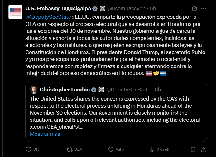 En su comunicado, difundido a través de X, la embajada señaló que el gobierno estadounidense “sigue de cerca” los acontecimientos políticos en Honduras y coincide plenamente con la preocupación expresada por la OEA, organismo que recientemente pidió garantías institucionales para evitar cualquier vulneración al voto ciudadano.