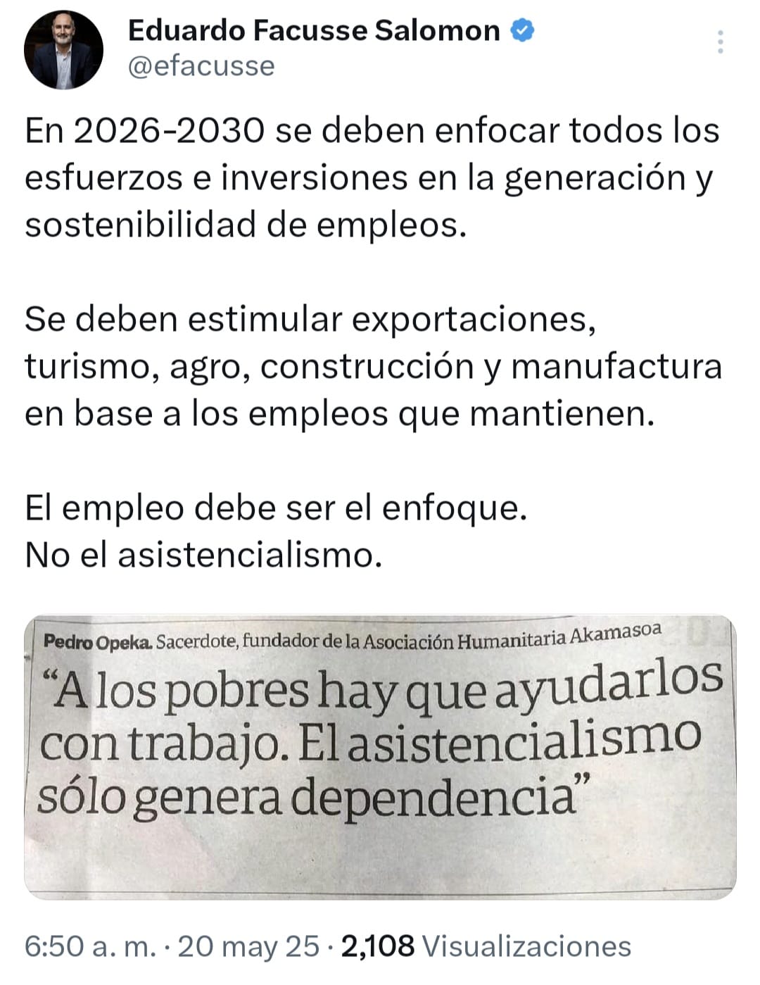 Desde su cuenta de X (antes Twitter), Facussé compartió una reflexión basada en un artículo del sacerdote Pedro Opeka, reconocido por su lucha contra la pobreza en Madagascar. El texto, titulado “A los pobres hay que ayudarlos con trabajo”, refuerza la idea de que el verdadero cambio social nace del empleo, no de la dádiva. “El empleo debe ser el enfoque. No el asistencialismo”, escribió Facussé, en una declaración que ha generado amplio eco en redes sociales y sectores empresariales.