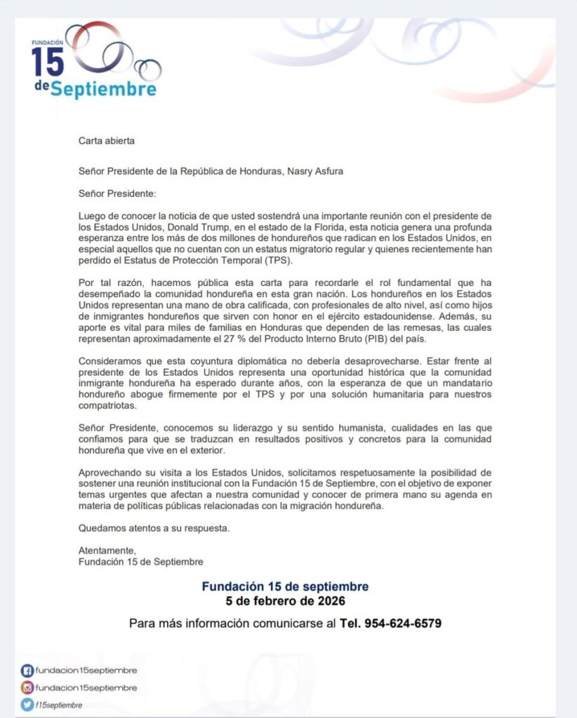 Tegucigalpa, Honduras.- La Fundación 15 de Septiembre colocó en la agenda pública un llamado de alto peso humano al solicitar al presidente Nasry Asfura asumir una postura firme en favor de los migrantes hondureños durante su próximo encuentro con el mandatario de Estados Unidos, Donald Trump, en un contexto marcado por tensión migratoria, temor colectivo en la diáspora, así como urgencia diplomática. El pronunciamiento surge como una voz que conecta emoción, política exterior, economía nacional, destino de millones de familias.