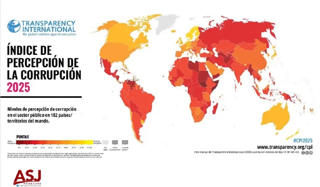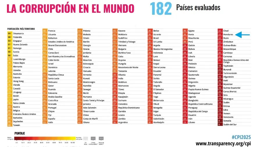 Tegucigalpa, Honduras.- Honduras enfrenta un nuevo golpe a su imagen internacional tras conocerse el Índice de Percepción de la Corrupción 2025 (IPC), donde obtiene apenas 22 puntos de 100, cifra que lo coloca en la posición 157 de 182 países evaluados. El dato no solo refleja estancamiento: expone un retroceso relativo frente a naciones que sí lograron avances en control institucional, justicia pública, transparencia estatal.