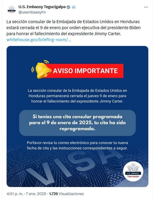 Tegucigalpa, Honduras.- La Embajada de Estados Unidos en Honduras ha anunciado que su sección consular permanecerá cerrada el jueves 9 de enero de 2025. Este cierre temporal se produce en el marco de los actos conmemorativos en honor al expresidente estadounidense Jimmy Carter, quien falleció el 29 de diciembre de 2025. La medida afectará a las personas con citas programadas para la solicitud de visas y otros servicios consulares en esa fecha.