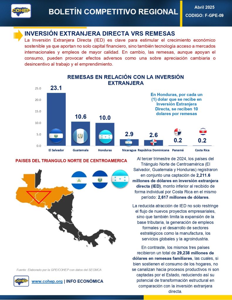 Tegucigalpa, Honduras.- Honduras recibe diez veces más ingresos por remesas familiares que por inversión extranjera directa (IED), según el Boletín Competitivo Regional publicado este jueves por el Consejo Hondureño de la Empresa Privada (Cohep). Esta alarmante proporción evidencia una creciente dependencia de los flujos enviados por los migrantes, frente a la escasa atracción de capital productivo que impulse el desarrollo sostenible del país.