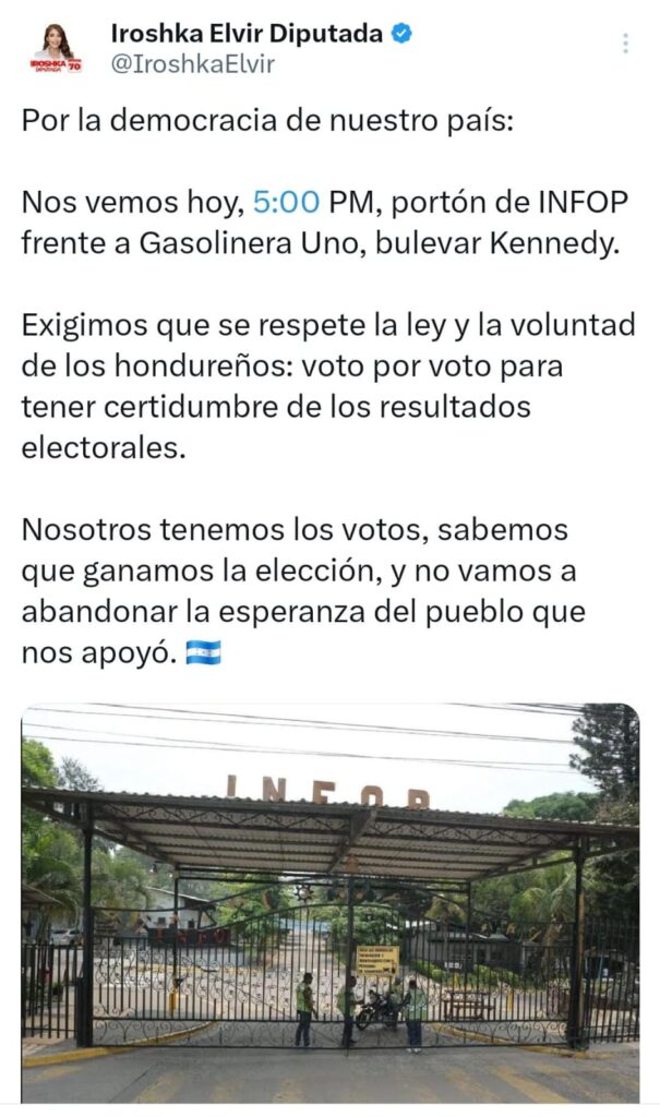 Tegucigalpa, Honduras.- La diputada Iroshka Elvir ha convocado a una manifestación para este lunes a partir de las 5:00 p.m., frente a la sede del Instituto de Formación Profesional (Infop), ubicado en el bulevar Centroamérica de Tegucigalpa. La protesta, que se realizará en el portón de acceso a Infop, a un costado de una gasolinera, tiene como principal objetivo exigir que se respete la ley y la voluntad del pueblo hondureño en el proceso electoral reciente.