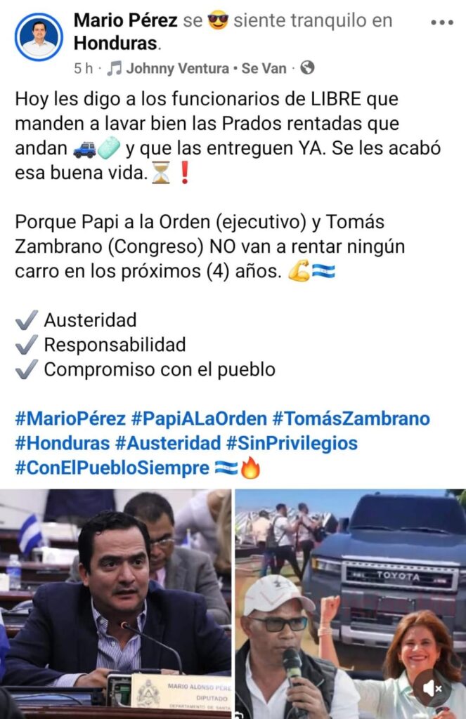 Tegucigalpa, Honduras.- En un tono firme que encendió el debate público, el diputado del Partido Nacional, Mario Pérez, solicitó este a funcionarios del Partido Libertad y Refundación (Libre) la devolución inmediata de vehículos rentados utilizados durante la administración de la presidenta Xiomara Castro, correspondiente al período 2022-2025, marcando un nuevo episodio en la discusión sobre el uso de fondos públicos.