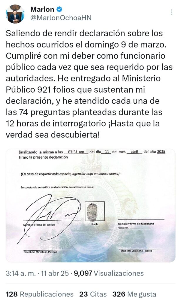 Durante la maratónica jornada, Ochoa fue interrogado por un equipo fiscal especializado, entregando 921 folios de respaldo documental y respondiendo 74 preguntas clave relacionadas con el retraso en la distribución del material electoral, especialmente en ciudades estratégicas como Tegucigalpa y San Pedro Sula. «Cumplí con mi deber como funcionario público. He atendido cada una de las preguntas planteadas y entregado pruebas contundentes. ¡Hasta que la verdad sea descubierta!», escribió Ochoa en su cuenta oficial al salir del interrogatorio, pasada la medianoche.