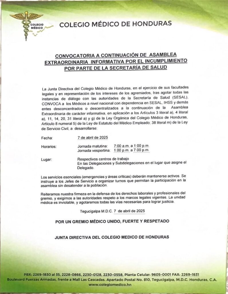 Según un comunicado del Colegio Médico de Honduras (CMH), los médicos que participan en las asambleas informativas solicitaron la presencia de la ministra de Salud, Carla Paredes, en la reunión para discutir de manera directa los problemas que enfrentan.