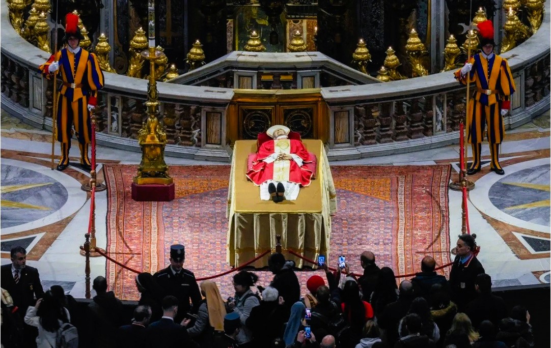 El féretro del papa Francisco fue colocado frente a la tumba de San Pedro, enfrente del imponente baldaquino de Bernini, y se acordonó la zona para que las personas se sitúen a una determinada distancia.