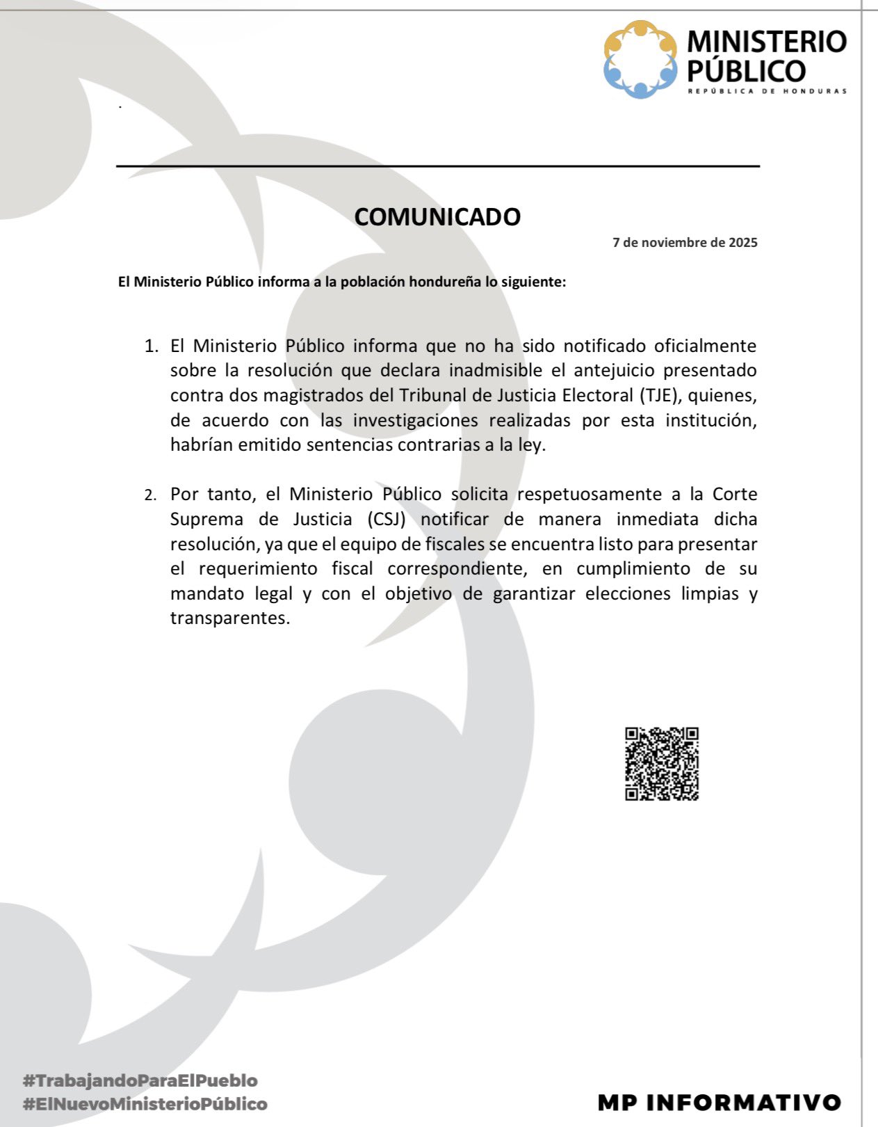 Mora aseguró que “los equipos fiscales están preparados para presentar el requerimiento ante un juez competente”, y subrayó que esta acción busca garantizar elecciones libres, transparentes y seguras. El vocero enfatizó que la medida es especialmente urgente considerando que las elecciones presidenciales, de diputados y alcaldes se realizarán en pocos días.
