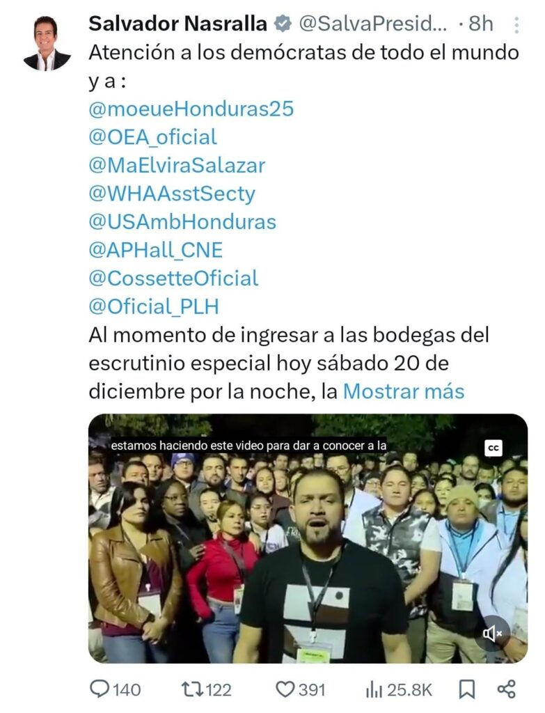 Tegucigalpa, Honduras.- El candidato presidencial Salvador Nasralla denunció graves irregularidades durante el inicio del «turno B» del escrutinio especial, desarrollado en las bodegas del Consejo Nacional Electoral (CNE). Según Nasralla, las Fuerzas Armadas (FF AA) impusieron restricciones técnicas que violaron la ley y coaccionaron a los delegados del Partido Liberal (PL), generando un ambiente de intimidación.