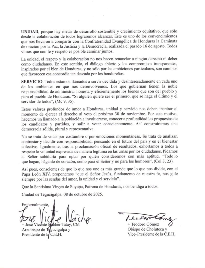 Tegucigalpa, Honduras.- En un comunicado emitido por la Conferencia Episcopal de Honduras (CEH), los obispos del país han pedido respetar la voluntad legítima expresada en las urnas durante las recientes elecciones. En su mensaje, reflexionaron sobre la importancia de votar con responsabilidad y conciencia, destacando que no se trata de elegir por costumbre ni por emociones pasajeras, sino de analizar, contrastar y decidir lo mejor para el futuro de Honduras.