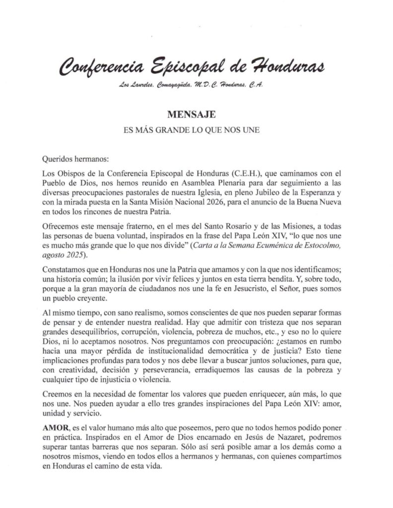Con un mensaje de unidad, los obispos también recordaron que lo que une al pueblo hondureño es más grande que lo que lo divide. En este sentido, invitaron a seguir las enseñanzas del Papa León XIV: “Que el Señor Jesucristo, fundamento de nuestra fe, nos guíe siempre por las sendas del amor, la unidad y el servicio”. Redacción Ruth Corrales.