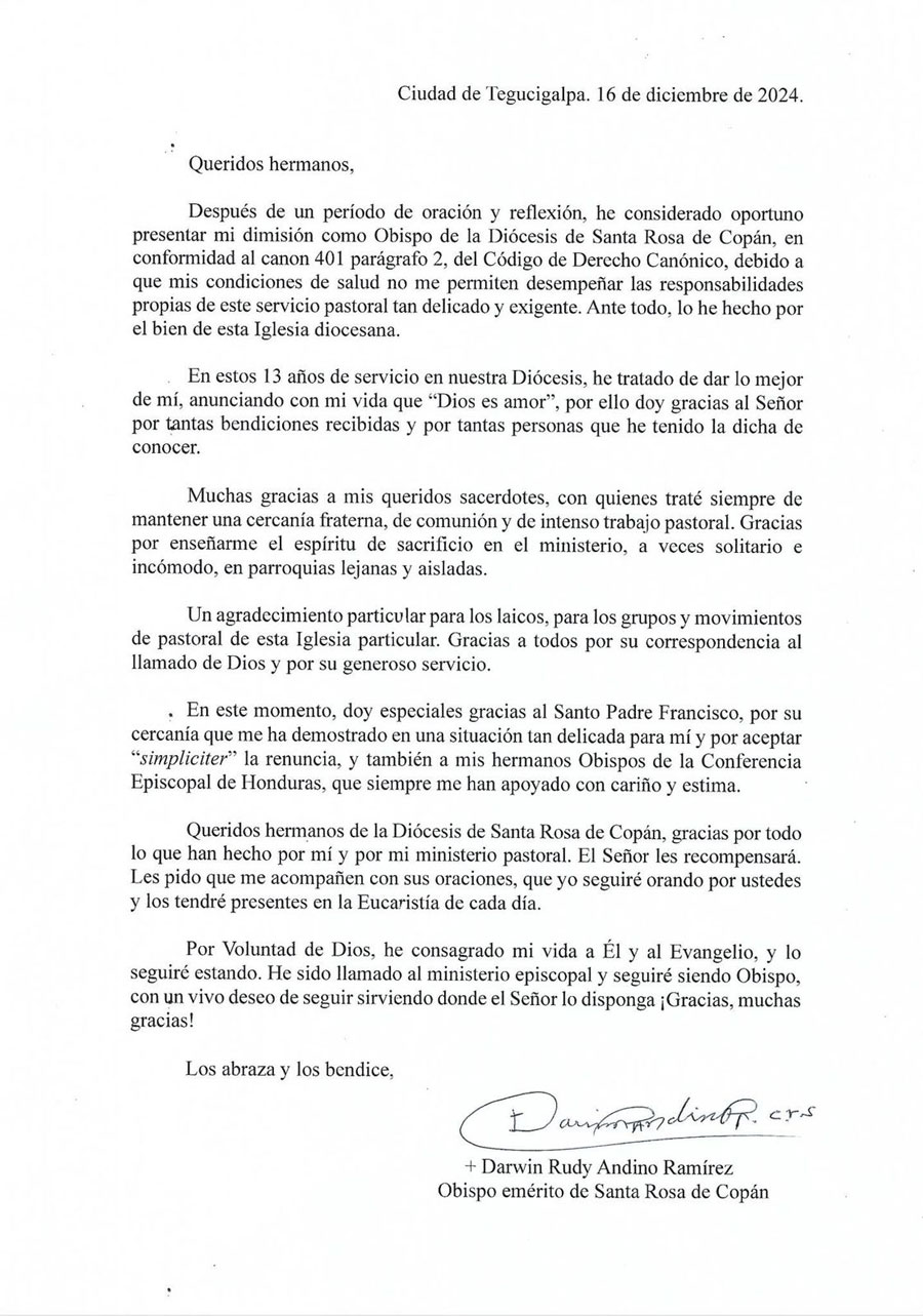Tegucigalpa, Honduras.- El papa Francisco ha aceptado la renuncia por motivos de salud de Monseñor Darwin Andino, quien sirvió como obispo de la Diócesis de Santa Rosa de Copán desde 2011. La decisión marca el cierre de una etapa significativa en la Iglesia hondureña, destacando la dedicación y el compromiso del líder religioso.