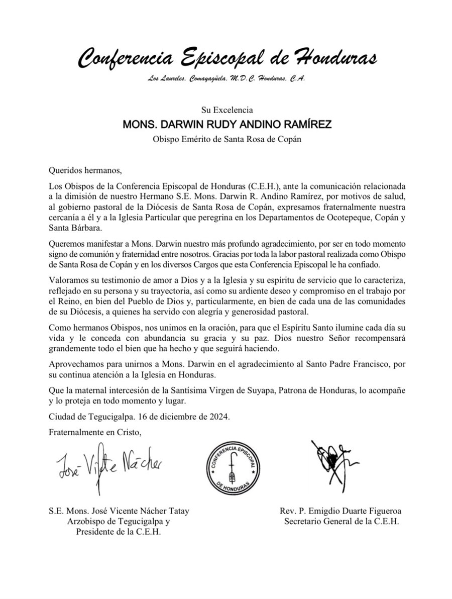 La Conferencia Episcopal de Honduras (C.E.H.) expresó su agradecimiento por el trabajo pastoral de Monseñor Darwin Andino, quien continuará su misión en la Iglesia como obispo emérito. Con esta transición, se resalta su deseo de mantenerse activo dentro de las posibilidades que le permita su salud, sirviendo a la comunidad católica en Santa Rosa de Copán.