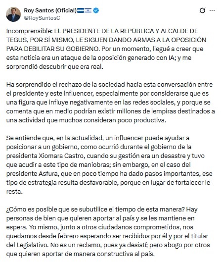 Santos subrayó que el apoyo presidencial a un encuentro entre creadores de contenido de Honduras y Perú no solo distrae la atención pública, sino que, a su juicio, otorga ventajas estratégicas a la oposición, debilitando la percepción de seriedad del mandato actual. El pastor incluso confió que, al conocer la noticia, pensó que podía tratarse de un montaje digital orquestado mediante Inteligencia Artificial, dada la inusual prioridad dada al entretenimiento frente a necesidades ciudadanas concretas.