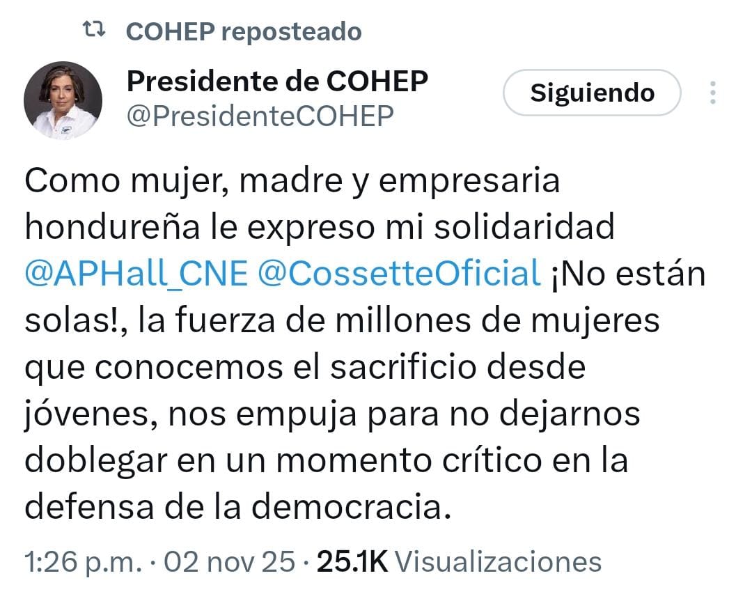 A través de su cuenta en X, Gallardo envió un mensaje claro: «Como mujer, madre y empresaria hondureña le expreso mi solidaridad @APHall_CNE @CossetteOficial ¡No están solas! La fuerza de millones de mujeres que conocemos el sacrificio desde jóvenes, nos empuja para no dejarnos doblegar en un momento crítico en la defensa de la democracia», escribió la presidenta del Cohep.