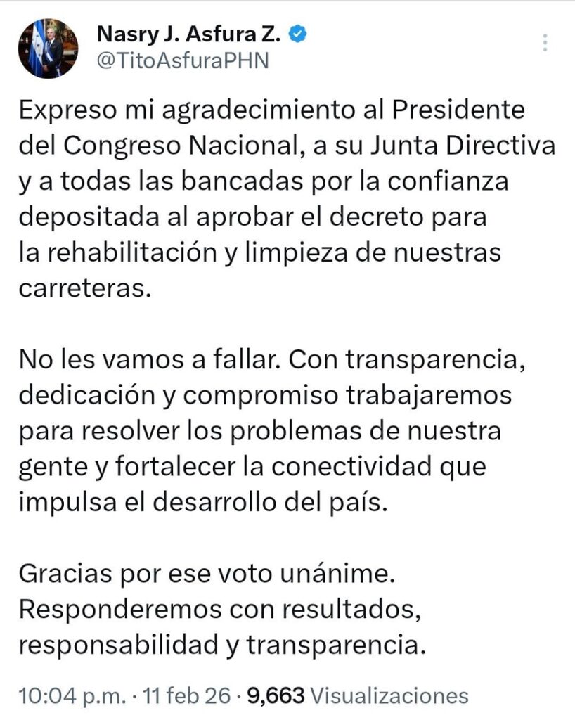 Tegucigalpa, Honduras.- El presidente Nasry Asfura expresó gratitud pública tras la aprobación unánime del decreto en el Congreso Nacional, medida que abre paso a la rehabilitación vial en todo el territorio, acción vista como impulso directo al desarrollo, la seguridad, la movilidad productiva.