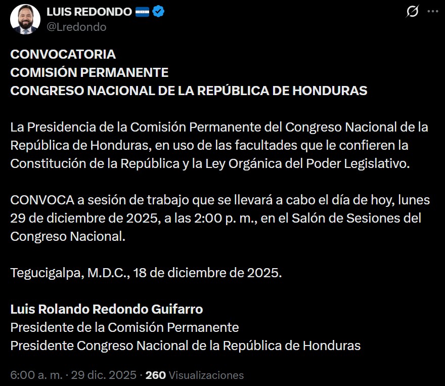 Tegucigalpa, Honduras | HonduPrensa.Com – Con una decisión que sacude el escenario político, el presidente del Congreso Nacional, Luis Rolando Redondo Guifarro, convocó de forma inmediata a la Comisión Permanente para sesionar este lunes 29 de diciembre de 2025 a las 2:00 p.m., en el hemiciclo legislativo, en medio de un ambiente cargado de tensión poselectoral.