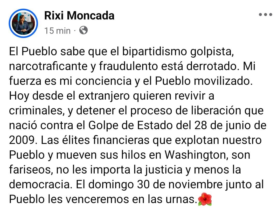 Moncada también acusó a “élites financieras que explotan al Pueblo y mueven sus hilos en Washington”, calificándolas como “fariseos” que no buscan justicia ni democracia. Agregó que el próximo 30 de noviembre, día de las elecciones generales, será el momento en que el pueblo hondureño “les vencerá en las urnas”.