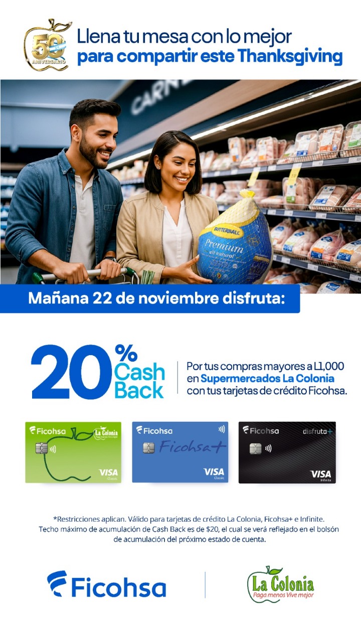 Tegucigalpa, Honduras.- Este sábado 22 de noviembre, Supermercados La Colonia consentirá a sus clientes con un beneficio especial: un 20% de cashback en todas las compras realizadas con tarjetas de crédito Ficohsa La Colonia, Ficohsa+ e Infinite, válido en sus 71 tiendas a nivel nacional y también en sus canales digitales.