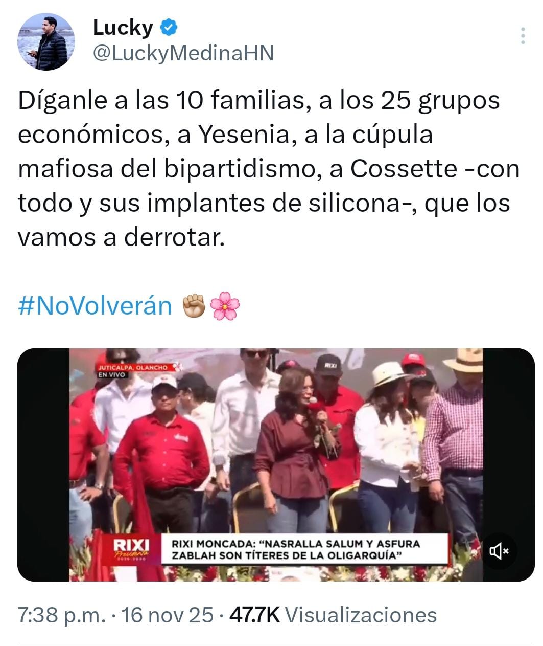 Medina, quien también ocupa el cargo de jefe de campaña de Libre, publicó un fuerte mensaje donde mencionó a López diciendo: “Díganle a las 10 familias, a los 25 grupos económicos, a Yesenia, a la cúpula mafiosa del bipartidismo, a Cossette -con todo y sus implantes de silicona-, que los vamos a derrotar”. Esta declaración, que rápidamente se viralizó, desató una serie de reacciones en redes sociales y medios de comunicación.